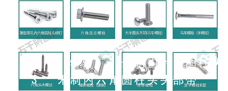 1.六角头(hexagon head)2.六角头法兰面(hexagon head with flange)3.方头(square head)4T形头T head (hammer head 5.扁圆头mushroom head(truss head)6.圆柱头(cheese head)7.圆头(round head)8.盘头(pan 头部大小按照美制标准ANSI18.3执行的尺寸是最大为13.97mm