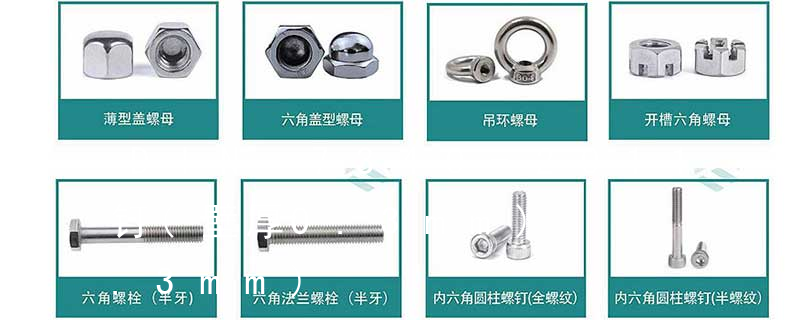 最常见的是六角头螺栓 国标GB5783 GB5782 德标Din933 Din931 (8.8级粗牙外六角螺栓)圆柱头内六角螺钉 国标GB70.1 德标Din912 还有很多像什么盘头十字螺钉 沉头十字螺钉 开槽盘头螺钉 开槽沉头螺钉等等很多种。螺母的种