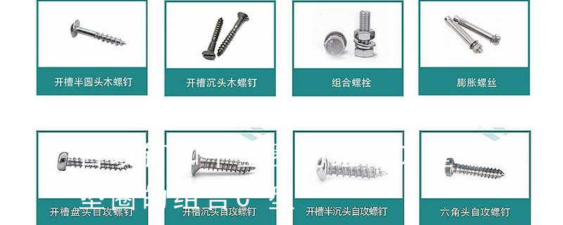 沉头内六角螺钉(平杯)、半圆头内六角螺钉(圆杯)、十字槽盘头机螺钉、十字槽沉头机螺钉、十字槽大扁头机螺钉、十字槽盘头自攻钉、十字槽沉头自攻钉、十字槽大扁头自攻钉、全牙丝杆(牙条)、六角螺母、法兰 十字槽盘头组合螺钉,也叫作十字槽圆头组合螺钉,或也叫十字槽半圆头组合螺丝,还有一种叫法,国家标准叫法为十字槽盘头螺钉,弹簧垫圈和平垫圈的组合件。按国家标准,也就是国标有二种,当然这里我们指的是三组合螺钉,盘头组