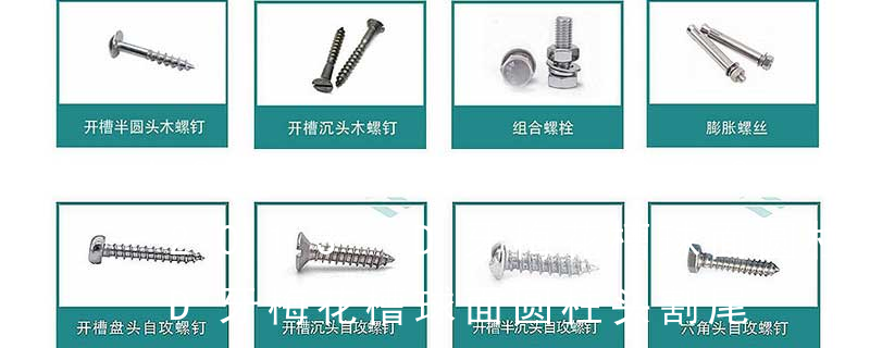T头螺丝 T HEAD BOLTS 马车螺丝 CARRIAGE BOLTS 环首螺丝 EYE BOLTS 内六角孔螺丝 HEX SOCKET CAP SCREWS 固定螺丝 SET SCREWS 螺椿栓 STUD BOLTS 螺旋椿 SCREW STUDS 轮壳螺栓 WHEEL BOLTS 翼形螺丝 WING SCREWS 自攻螺丝 SELF T