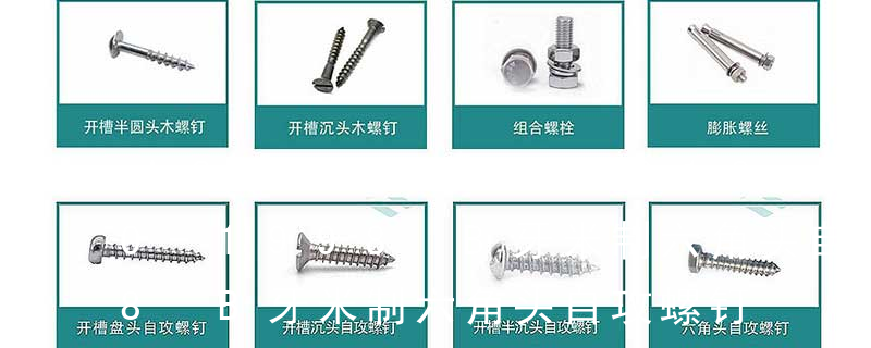 1.机螺钉 2.自攻螺钉 3.钻尾螺钉 4.墙板钉 5.纤维板钉 6.木螺钉7.六角木螺钉 8.不脱出螺钉 9.组合螺钉 10.微型螺钉 11.家具螺钉 12.电子螺钉 13.链带螺钉头型 :1.六角头(hexagon head)2.六角头法兰面(hexagon head with flange)3.方头(square head)4.T形头T head (hammer head5.